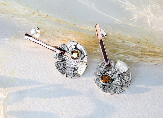 Pendientes de plata 925 y detalle en cobre con un citrino Madeira.
